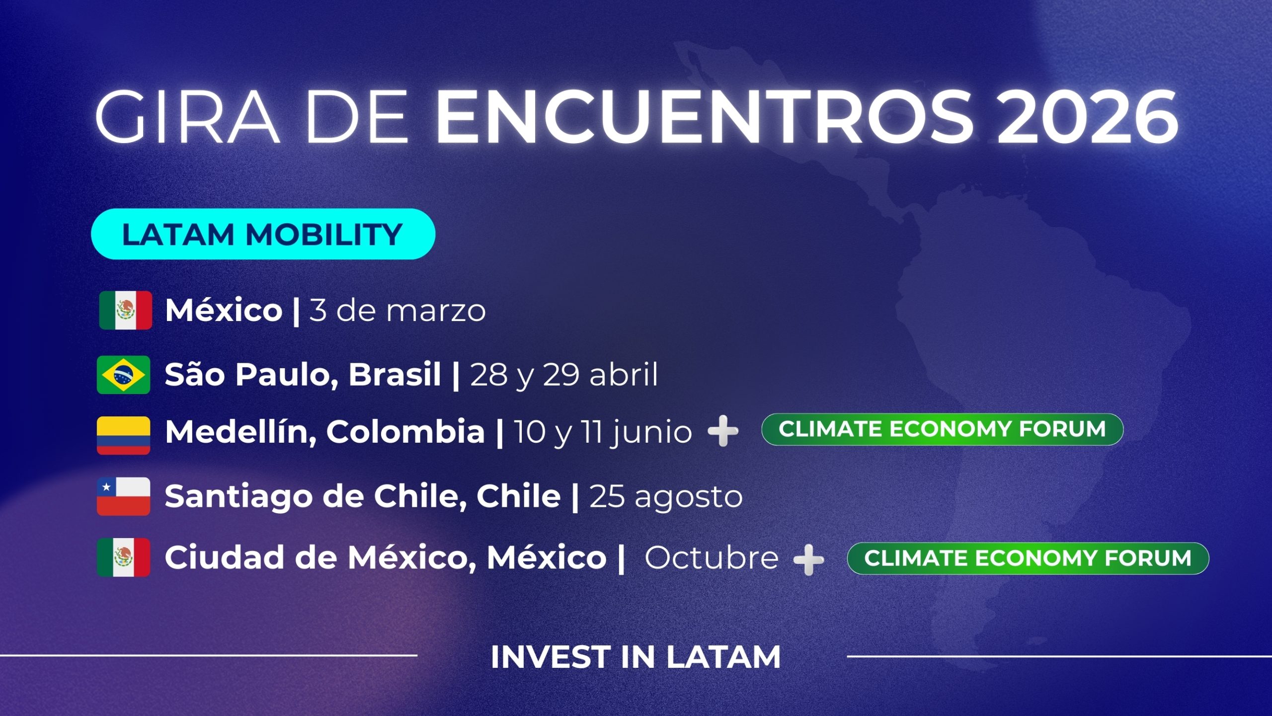 Con un enfoque que combina tecnología, sostenibilidad y visión de futuro, Latam Mobility 2026 invita a todos los actores de la cadena de valor a participar en este recorrido que marcará la agenda regional de la movilidad limpia. Únete a los encuentros en México, São Paulo, Medellín, Santiago y Ciudad de México y sé parte del movimiento que acelera la transformación energética y urbana de América Latina.